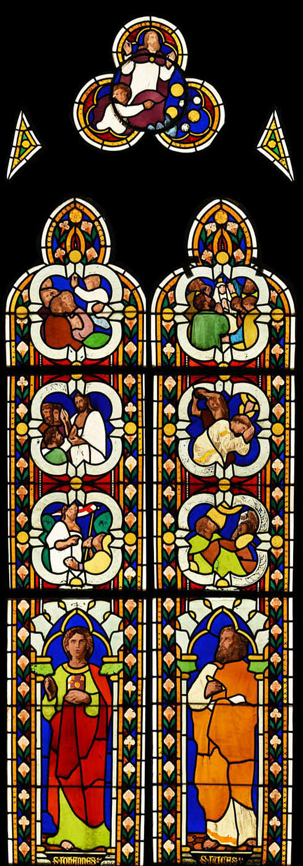 Das Chorfenster rechts von der Mittelachse zeigt Szenen, die im Zusammenhang mit der Auferstehung von Jesus Christus stehen, sowie Darstellungen der Evangelisten Johannes und Lukas.
