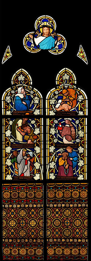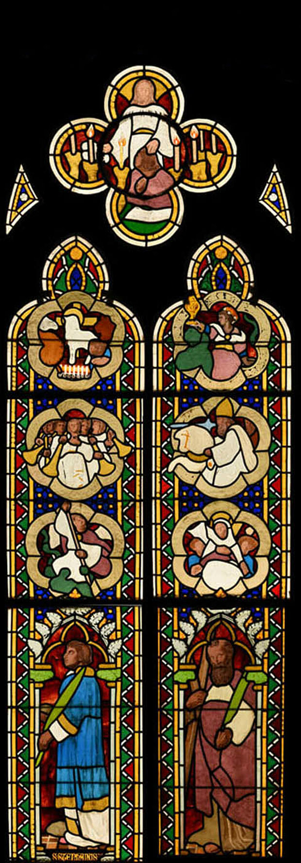 Das Chorfenster ganz rechts ist nur von der Empore aus zu sehen und zeigt Szenen, die den im „Buch der Offenbarung" des Evangelisten Johannes beschriebenen Visionen der Apokalypse entstammen, sowie Darstellungen der Heiligen Stephanus und Andreas.