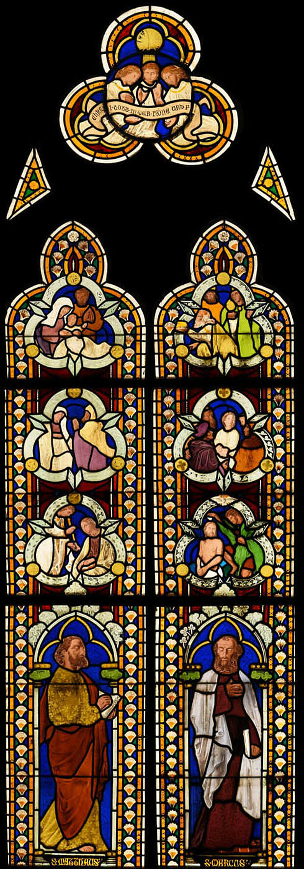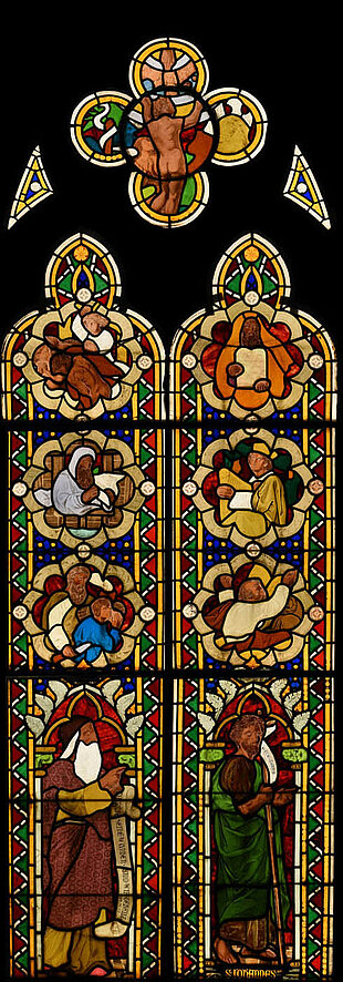 Das Fenster links von der zentralen Chorachse hat die Menschwerdung von Jesus Christus zum Inhalt und zeigt diese in mehreren Szenen, unten sind die Evangelisten Matthäus und Markus dargestellt.