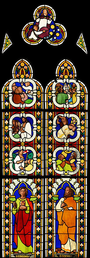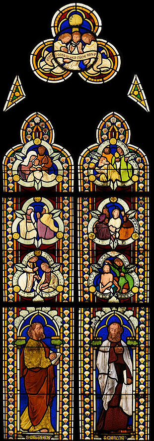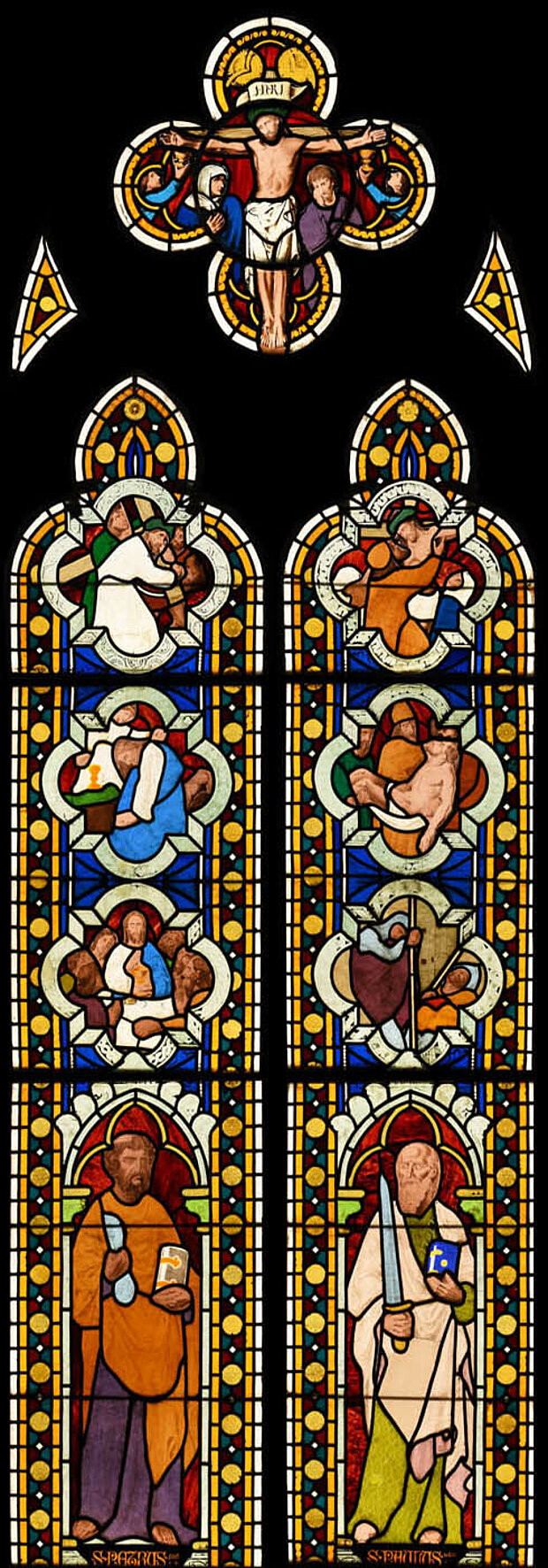 Das zentrale Chorfenster über dem Altar zeigt sieben Szenen zum Opfertod von Jesus Christus sowie unten die Apostel Petrus und Paulus.