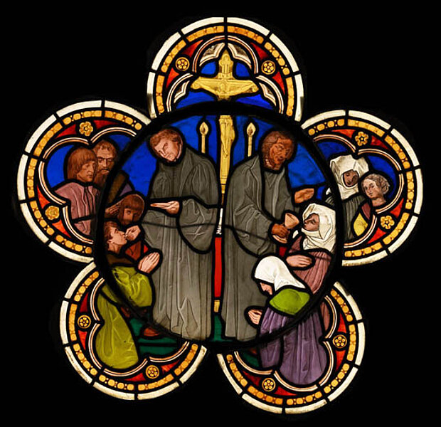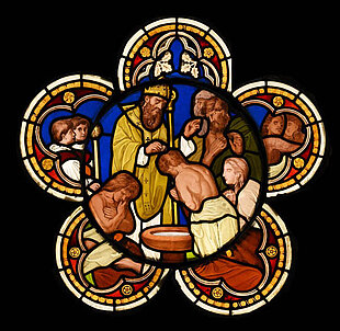 Ganz außen über den Emporen (und von dort am besten sichtbar) befinden sich zwei weitere Fenster in Fünfpassform, die christliche Sakramente (rituelle Handlungen) zum Inhalt haben.