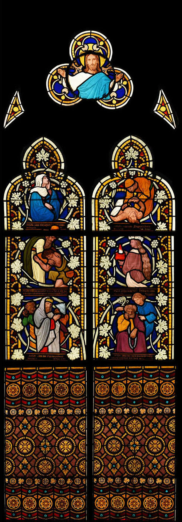 Das Fenster rechts oben vor dem Chor gegenüber der Kanzel bezieht sich auf die in der Bergpredigt von Jesus Christus enthaltenen „Seligpreisungen" und zeigt Szenen aus entsprechenden Gleichnissen. Unten erscheinen zwei illusionistische Wandvorhänge.