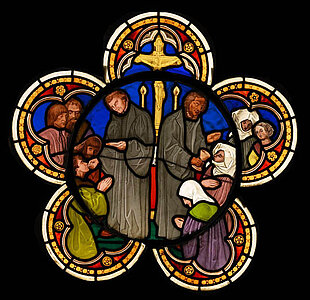 Weibliche, nach oben zu Jesus Christus gerichtete Gestalt, darunter SELIG SIND DIE GEISTLICH ARM SIND (MATTH. 5.3 *…+9.).